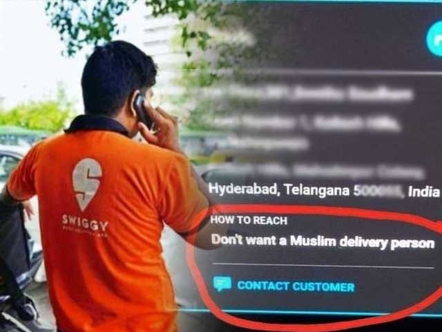 بھارتی میڈیا کی رپورٹس کے مطابق بھارتی ریاست تلنگانہ کے شہر حیدر آباد میں شرمناک واقعہ پیش آیا جہاں سوئیگی فوڈ ڈیلیوری پر صارف نے کھانا ڈیلیور کرنے کے لیے کسی مسلمان ڈیلیوری بوائے کو نہ بھیجے کا مطالبہ کیا۔