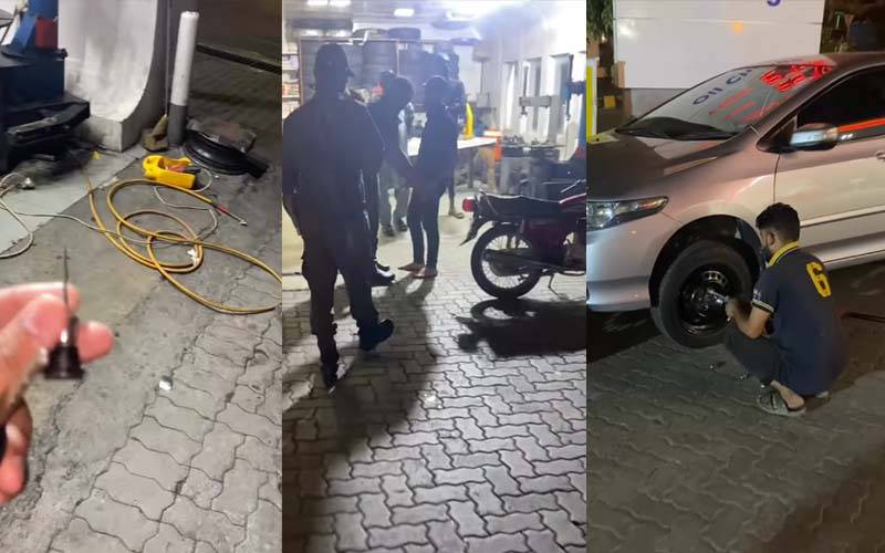 ویڈیو میں شہری کا کہنا تھا کہ میں اپنی گاڑی کا ٹائر ایچ بلاک ڈی ایچ اے فیز ون میں تبدیل کروانے آیا تھا،اسی دوران ٹائر شاپ کا ورکرنئے ٹائر میں کیل(سوا)سے سوراخ کرتے ہوئے رنگے ہاتھوں پکڑا گیا۔شہری نے پولیس کو کال کرکے ٹائر شاپ ورکر اور مالک کو پکڑوا دیا۔