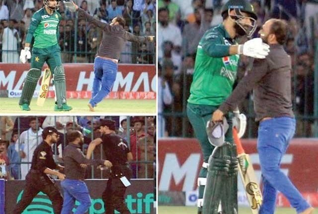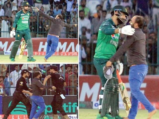 وسیم اکرم انکلوژر سے آنے والے تماشائی نے بیٹر شاداب خان کو سلیوٹ کیا، گلے لگایا اور گرائونڈ سے باہر بھاگ گیا،راستے میں اس نے خوشی سے ایک قلابازی بھی لگائی اور باؤنڈری کی جانب دوڑ لگا دی، سیکیورٹی حکام گرفتار کرنے آئے تو خوشی خوشی اپنے آپ کو ان کے حوالے کر دیا، آفیشلز اس کو گراؤنڈ سے باہر لے گئے۔