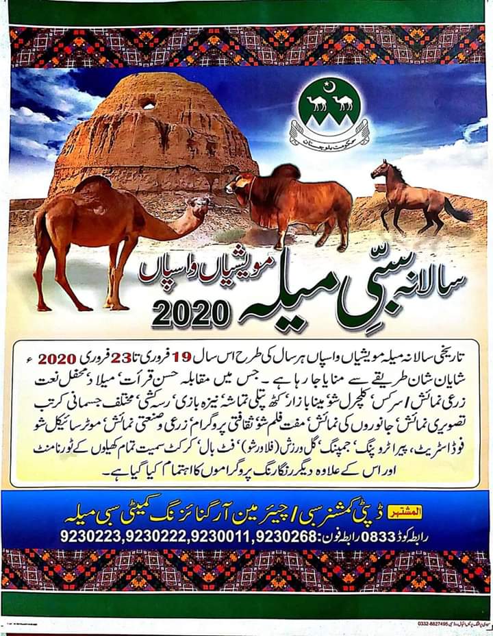سبی کا تاریخی 5 روزہ میلہ مویشیاں واسپاں 19 فروری سے شروع ہو گا جو 23 فروری تک جاری رہے گا.سبی کے تاریخی میلے کی افتتاحی تقریب میں وزیراعظم پاکستان عمران خان ،جبکہ اختتامی تقریب میں صدر مملکت شرکت کریں گے