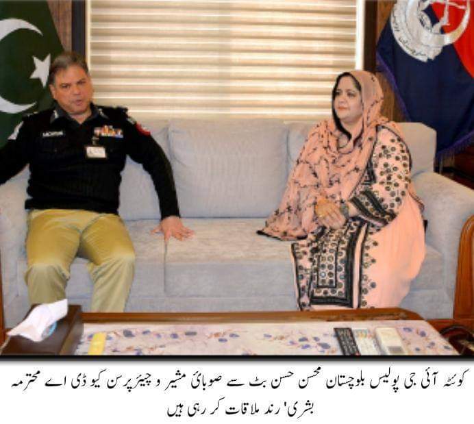 صوبائ مشیر و چیئرپرسن کیو ڈی اے محترمہ بشری’ رند نے کہا ہے کہ دہشت گردی کی جنگ اور جرائم کے خاتمے میں بلوچستان پولیس فعال اور متحرک کردار ادا کررہی ہے پولیس کی قربانیوں سے صوبے میں امن قائم ہوا ان خیالات کا اظہار انہوں نے آئی جی پولیس آفس کے دفتر کے دورے کے موقع پر آئی جی پولیس محسن حسن بٹ سے گفتگو کرتے ہوئے کیا آئی جی پولیس محسن حسن بٹ نے صوبائ مشیر و چیئرپرسن کیو ڈی اے محترمہ بشری’ رند کو بلوچستان پولیس سے متعلق امور، امن وامان کی صورتحال، دہشت گردی اور عمومی جرائم کے خاتمے کے لئے جاری اقدامات، پولیس فورس کی ویلفیئر اور ضروریات کے حوال سے تفصیلی بریفنگ دی بعدازا صوبائ مشیر و چیئرپرسن کیو ڈی اے محترمہ بشری’ رند نے اپنے دورے کے موقع پر بلوچستان پولیس کی کارکردگی کو سراہا اور دیگر افسران سے بھی ملاقات کی آخر میں آئی جی پولیس محسن حسن بٹ نے بلوچستان پولیس کی جانب سے صوبائ مشیر و چیئرپرسن کیو ڈی اے محترمہ بشری’ رند کو شیلڈ بھی پیش کیں۔