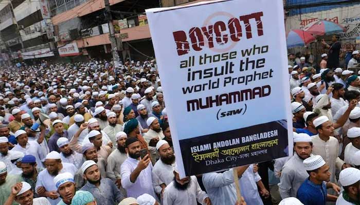 بھارت میں توہین آمیز بیانات پر بنگلادیش میں احتجاج کا سلسلہ جاری ہے۔ آج بھی 10 ہزار کے قریب مسلمانوں نے توہین آمیز بیانات کے خلاف احتجاج کیا۔