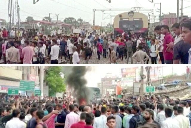 بھارت میں فوجی بھرتیوں کے نئے متنازع نظام کے خلاف مظاہرے پھوٹ پڑے۔ مشتعل افراد نے حکمراں جماعت بی جے پی کے دفتر کو نذر آتش کردیا ۔جلاؤگھیراؤ کے دوران بس اور نجی گاڑیوں کو نقصان پہنچا۔