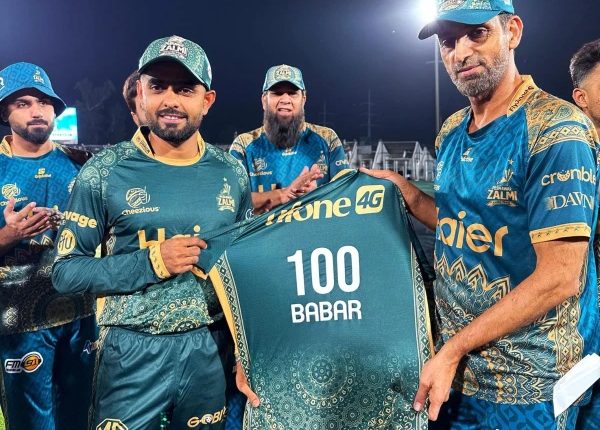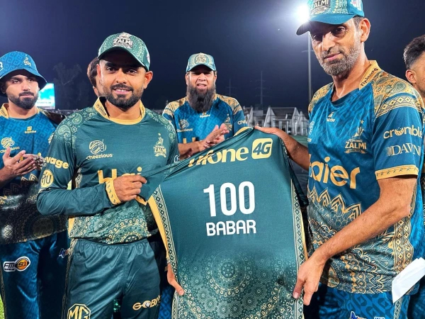 بابراعظم نے گزشتہ روز لاہور قلندرز کے خلاف اپنے پی ایس ایل کیریئر کا 100 واں میچ کھیلا، اس موقع پر انہیں پشاور زلمی کی جانب سے خصوصی جرسی بھی دی گئی جس پر 100 کا ہندسہ درج تھا۔