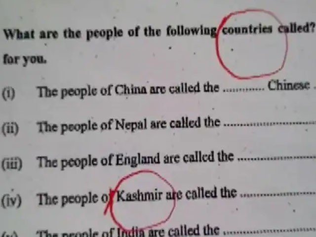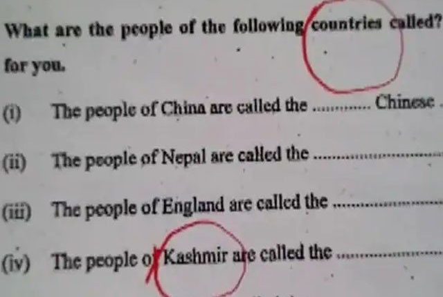 بھارتی میڈیا کے مطابق ریاست بہار میں ساتویں جماعت کے انگریزی کا امتحان لیا گیا جس میں طلباء سے پوچھا گیا کہ ” جس طرح چین کے لوگوں کو چینی کہا جاتا ہے اسی طرح مندرجہ ذیل ممالک کے لوگوں کو کیا کہا جاتا ہے؟” اور ان ممالک کی فہرست میں کشمیر کا نام بھی شامل تھا۔