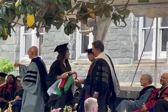 فلسطینی طالبہ نوران اپنی ڈگری لینے کے لئے فلسطینی پرچم لہراتی سٹیج پر آئیں، ڈگری وصول کی لیکن امریکی وزیر خارجہ ٹونی بلنکن سے ہاتھ نہیں ملایا اور کچھ سناتی ہوئی آگے بڑھ گئیں۔