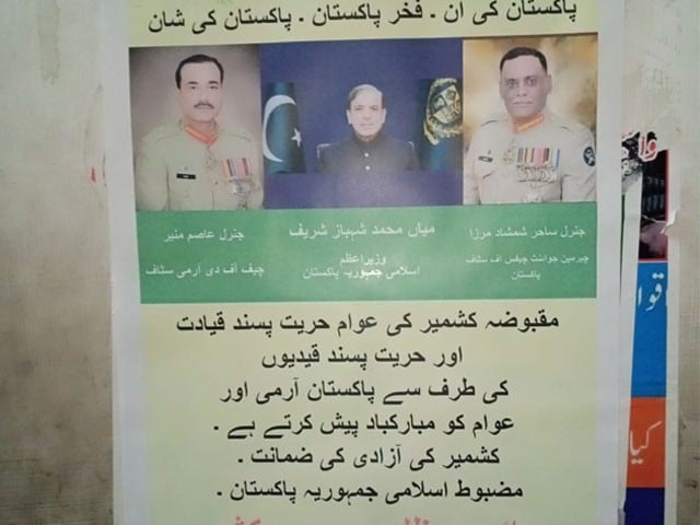 مقبوضہ کشمیر میں وزیراعظم شہباز شریف ، آرمی چیف جنرل عاصم منیر اور چئیرمین جوائنٹس چیف آف اسٹاف کمیٹی جنرل ساحر شمشاد کے پوسٹرز چسپاں کردیے گئے۔
