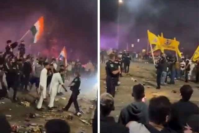 سماجی رابطوں کی ویب سائٹس پر جاری ویڈیوز میں دیکھا جا سکتا ہے کہ پولیس اہل کار خالصتان اور بھارتی پرچم اٹھائے ہوئے مشتعل افراد کو جھگڑنے سے روکنے کی کوشش کررہے ہیں۔ اس موقع پر موجود بھارتی تارکین وطن نعرے بازی بھی کرتے رہے۔