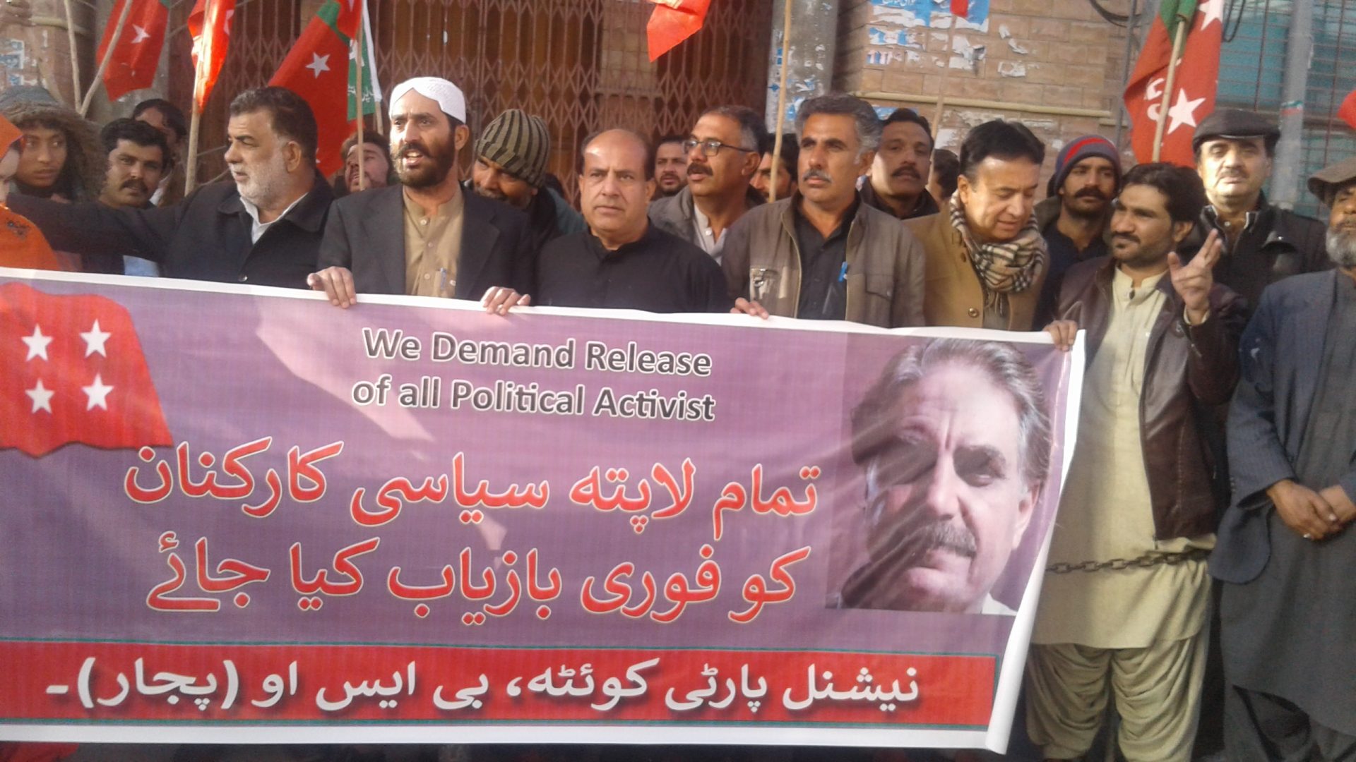 نیشنل پارٹی کے زیر اہتمام پارٹی کے رہنماء ادریس خٹک سمیت تمام سیاسی کارکنوں کی جبری گمشدگی کے خلاف پریس کلب کے سامنے احتجاجی مظاہرہ کیا گیا۔ مظاہرے سے پارٹی کے مرکزی رہنماء حاجی نیاز بلوچ، صوبائی ترجمان علی احمد لانگو، ستار بلوچ، کلثوم نیاز، حنیف کاکڑ، بی ایس او پجار کے ڈاکٹر طارق بلوچ و دیگر دوستوں نے خطاب کرتے ہوئے پارٹی رہنماء ادریس خٹک سمیت تمام لاپتہ افراد کی بازیابی کا مطالبہ کیا۔
