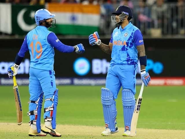 بھارت کی جانب سے سوریا کمار یادیو 16 اور دنیش کارتک 1 رن بناکر کریز پر موجود رہے تاہم دنیش کارتک 101 کے مجموعی اسکور پر پویلین واپس روانہ ہوگئے، دوسرے اینڈ پر سوریا کمار یادوو نے شاندار بیٹنگ کرتے ہوئے ٹیم کا اسکور بڑھایا اور چالیس گیندوں پر 68 رنز کی زبردست اننگز کھیلی۔